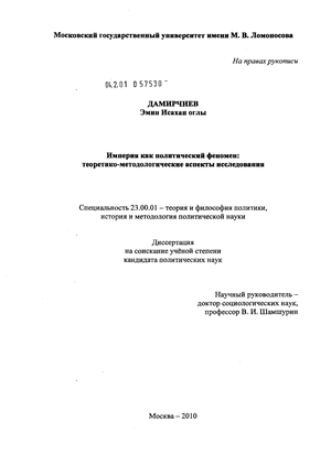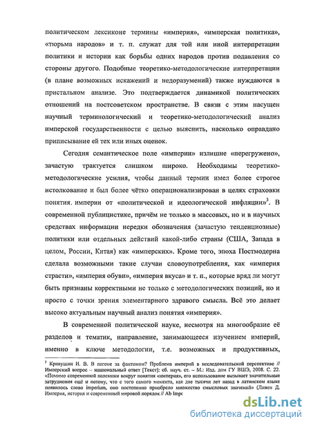 Цель диссертации - исследование империи как политического феномена . Выполнение её связано с преодолением методологических затруднений, возникающих при изучении империи, и должно также опираться на анализ конкретного исторического материала.