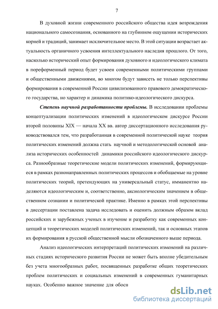 Степень научной разработанности проблемы. В исследовании проблемы концептуализации политических изменений в идеологическом дискурсе России второй половины XIX – начала XX вв. автор диссертационного исследования руководствовался тем, что разработанная в современной политической науке теория политических изменений должна стать научной и методологической основой анализа исторических особенностей динамики российского идеологического дискурса. Разнообразные теоретические модели политических изменений, формирующиеся в рамках разнонаправленных политических процессов и обобщаемые на уровне политических теорий, претендующих на универсальный статус, имманентно наделяются идеологическим и, соответственно, аксиологическим значением в общественном сознании и политической практике. Именно в рамках этой перспективы в диссертации поставлена задача исследовать и оценить должным образом вклад российских и зарубежных ученых в изучение и разработку как современных концепций и теоретических моделей политических изменений, так и основных этапов их формирования в русской общественной мысли обозначенного выше периода.