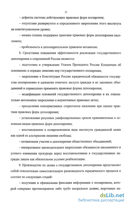 10. Необходимо принятие специального кодифицированного акта - федерального закона Российской Федерации «Об основаниях и порядке лишения государственных наград и иных правовых форм поощрения», в котором дать развернутую дефиницию государственного депоощрения, назвать его основные разновидности, раскрыть принципы, детально изложить процедуру возложения этой нетипичной юридической ответственности, установить механизм его обжалования (опротестования).