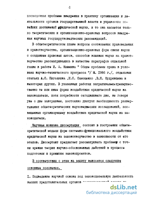 В общетеоретическом плане вопросы соотношения правоведения и правотворчества, организационно-правовых форм связи науки с созданием правовых актов, способов влияния науки на правотворчество рассматривались в качестве параграфов отдельной главы в работе И. Ф. Кашина п Общие проблемы права в условиях научно-технического прогресса "/ М. 1986 т./, отдельных статьях А.С. Пиголкина ,И.С. Оамощенко ,В.Н. Кудрявцева и некоторых других. В указанных работах затрагивалисьпреимушес-твенно те или иные формы воздействия юридической науки на законодателя, хотя потребности сегодняшнего дня, не говоря уже о дне завтрашнем, постоянно диктуют необходимость развертывания общетеоретических науковедяеских исследований, посвященных организующему воздействию юридической науки на законодателя,