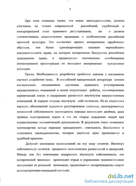 Третье. Необходимость разработки проблемы связана с состоянием научной разработки темы. В российской юридической литературе немало исследований, посвященных изучению правового регулирования имущественных отношений и почти отсутствуют работы, анализирующие юридический статус и содержание различных институтов имущественных отношений. В первую очередь института собственности. Из-за отсутствия научных обоснований правового регулирования сложных, многоуровневых отношений собственности законодатель нередко использует двойное, даже тройное нормирование одних и тех же сторон поведения людей при осуществлении экономической деятельности. В результате этого возникают противоречия между нормами гражданского, земельного, бюджетного и налогового законодательства, которые наиболее ярко проявляются в судебной практике.