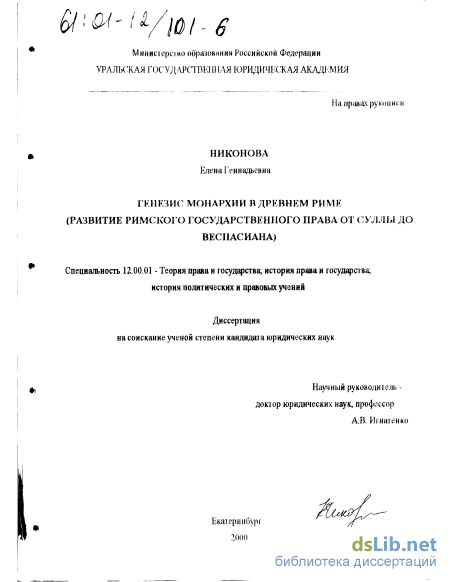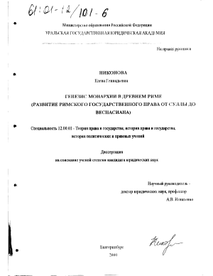Мейер2, Р. Сайм3, В.И. Герье4, Э.Д. Гримм5, В.М. Хвостов6, М.И. Ростовцев7, И.А. Покровский8, Н.А. Машкин9, СИ. Ковалев10, С.Л. Утченко", А.Б. Егоров12 и др.). Однако, труды, созданные в данной области, почти не затрагивают правовые основы верховной власти в Римском государстве, так как посвящены изучению других проблем, а работы, рассматривающие юридические основы власти (В.М. Хвостов, Т. Моммзен), показывают их в статике либо в отрыве от жизни общества, экономических и социальных условий. Не исследованы предпосылки централизации власти fc в римском государстве. Автору не известно ни одного специального исследования, посвященного проблеме генезиса римской монархии. Диссертация впервые в отечественной историко-правовой науке направлена на подробный комплексный анализ постепенного перерастания (его причин и условий, этапов, направлений) республиканской формы правления в монархическую на фоне структурно-функциональных изменений в государственном механизме. : Научно-практическая значимость работы Результаты исследования помогают глубже понять гоударственноправо- ___, вые вопросы форме римского государства I в. до н.э. - I в. н.э. По материалам диссертации может быть подготовлено учебное пособие, позволяющее студентам получить конкретно-историчекии материал по различным вопросам права « Древнего Рима и предназначенное для использования в процессе преподавания не только истории государства и права зарубежных стран, но и теории государства и права, конституционного права и некоторых других юридических учебных дисциплин. Обобщения и выводы, содержащиеся в работе, могут быть использованы при разработке спецкурсов по проблемам римского публичного права, при чтении лекций по курсу истории государства и права зарубежных —• стран, а также в дальнейшей научной разработке темы.