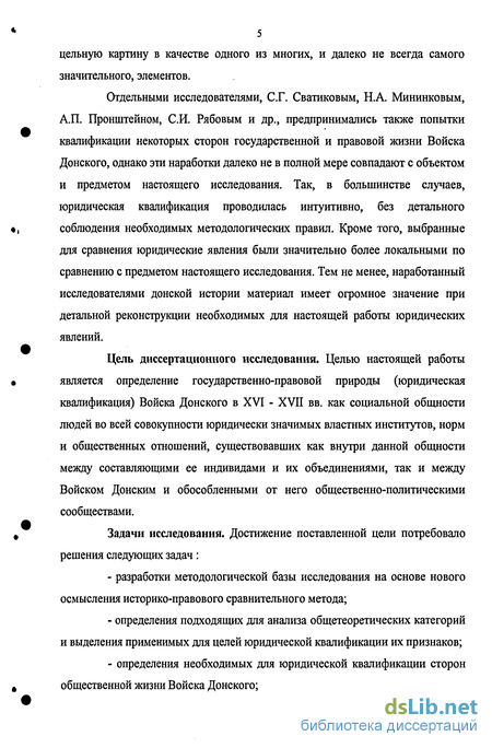 Цель диссертационного исследования. Целью настоящей работы является определение государственно-правовой природы (юридическая квалификация) Войска Донского в XVI - XVII вв. как социальной общности людей во всей совокупности юридически значимых властных институтов, норм и общественных отношений, существовавших как внутри данной общности между составляющими ее индивидами и их объединениями, так и между Войском Донским и обособленными от него общественно-политическими сообществами.