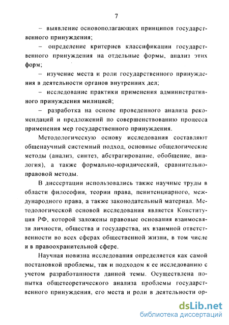 Научная новизна исследования определяется как самой постановкой проблемы, так и подходом к ее исследованию с учетом разработанности данной темы. Осуществлена попытка общетеоретического анализа проблемы государственного принуждения, его места и роли в деятельности ор ганов внутренних дел. Впервые в отечественной теоретико-правовой литературе феномен государственного принуждения исследуется в контексте становления в России правового государства, формирования правовых начал общественной жизни, с учетом приоритетного значения прав и свобод человека и гражданина.