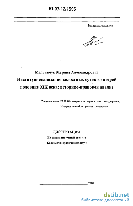Вместе с тем, в современной юридической литературе пока не имеется специальных работ, посвященных постановке и исследованию вопросов институционализации волостных судов во второй половине XIX века. Полноценное исследование волостной юстиции на наш взгляд, предполагает, с одной стороны, общетеоретическое осмысление накопленного исторического материала. С другой стороны, подлинный смысл и сущность институционализации могут быть уяснены только на основе ее многочисленных проявлений, в том числе в ходе исследования генезиса института волостной юстиции.