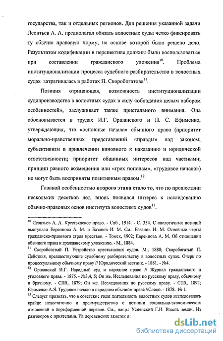 В разрезе проблематики нашего диссертационного исследования представляется необходимым отметить особо труды А.А. Леонтьева, в которых обосновывается тезис о необходимости институционализировать волостное судопроизводство путем ограничения действия обычного права и постепенном слиянии его с позитивным правом9. Примечательно, что наиболее удобным способом для этого признана кодификация обычного права как в рамках всего государства, так и отдельных регионов. Для решения указанной задачи Леонтьев А. А. предполагал обязать волостные суды четко фиксировать ту обычно правовую норму, на основе которой было решено дело. Результатом кодификации в перспективе должны были воспользоваться при составлении гражданского уложения10. Проблема институционализации процесса судебного разбирательства в волостных судах затрагивалась в работах П. Скоробогатова11.