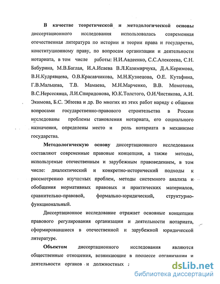 диссертационного исследования использовалась современная отечественная литература по истории и теории права и государства, конституционному праву, по вопросам организации и деятельности нотариата, в том числе работы: Н.И.Авдеенко, С.С.Алексеева, С.Н. Бабурина, М.В.Баглая, И.А.Исаева В.Л.Казимирчука, Д.А.Керимова, В.Н.Кудрявцева, О.В.Красавчикова, М.Н.Кузнецова, О.Е. Кутафина, Г.В.Мальцева, Т.В. Мамаева, М.Н.Марченко, В.В. Момотова, В.С.Нерсесянца, Л.И.Спиридонова, Ю.К.Толстого, О.И.Чистякова, А.И. Экимова, Б.С. Эбзеева и др. Во многих из этих работ наряду с общими вопросами государственно-правового строительства в России исследованы проблемы становления нотариата, его социального назначения, определены место и роль нотариата в механизме государства.