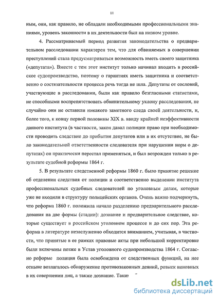 Важной вехой в организационно-правовом развитии предварительного расследования дореформенной России было принятие решение о введении института судебных следователей в 1860 г. и отделении их от подчинения полиции. 8 июня этого года Александром II были утверждены «Учреждение судебных следователей» 5, «Наказ судебным следователям»11 , «Наказ полиции о производстве дознания по происшествиям, могущим заключать в себе преступления или проступок» . Как справедливо отмечается в историко-правовой литературе, пореформенный период развития уголовного процесса России по сути дела исчисляется не с 1864 г., а с реформы предварительного расследования 1860 г., и в этой связи во многих работах о развитии права России данное событие незаслуженно обходится вниманием, учитывая, в частности, что указанные акты были при небольшой корректировке включены позже в Устав уголовного судопроизводства118.