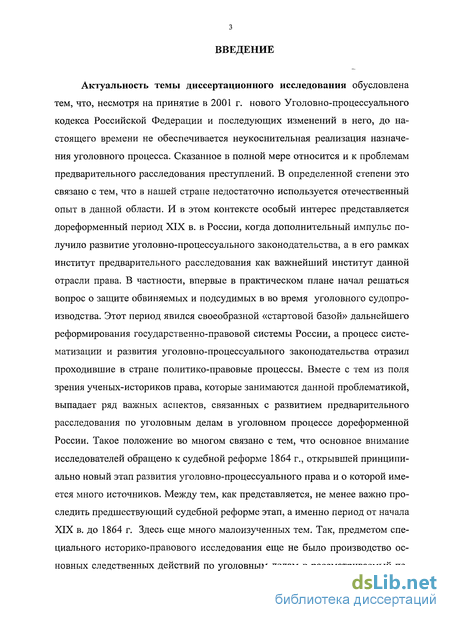 Актуальность темы диссертационного исследования обусловлена тем, что, несмотря на принятие в 2001 г. нового Уголовно-процессуального кодекса Российской Федерации и последующих изменений в него, до настоящего времени не обеспечивается неукоснительная реализация назначения уголовного процесса. Сказанное в полной мере относится и к проблемам предварительного расследования преступлений. В определенной степени это связано с тем, что в нашей стране недостаточно используется отечественный опыт в данной области. И в этом контексте особый интерес представляется дореформенный период XIX в. в России, когда дополнительный импульс получило развитие уголовно-процессуального законодательства, а в его рамках институт предварительного расследования как важнейший институт данной отрасли права. В частности, впервые в практическом плане начал решаться вопрос о защите обвиняемых и подсудимых в во время уголовного судопроизводства. Этот период явился своеобразной «стартовой базой» дальнейшего реформирования государственно-правовой системы России, а процесс систематизации и развития уголовно-процессуального законодательства отразил проходившие в стране политико-правовые процессы. Вместе с тем из поля зрения ученых-историков права, которые занимаются данной проблематикой, выпадает ряд важных аспектов, связанных с развитием предварительного расследования по уголовным делам в уголовном процессе дореформенной России. Такое положение во многом связано с тем, что основное внимание исследователей обращено к судебной реформе 1864 г., открывшей принципиально новый этап развития уголовно-процессуального права и о которой имеется много источников. Между тем, как представляется, не менее важно проследить предшествующий судебной реформе этап, а именно период от начала XIX в. до 1864 г. Здесь еще много малоизученных тем. Так, предметом специального историко-правового исследования еще не было производство основных следственных действий по уголовным делам в рассматриваемый пе- риод. Недостаточно исследованы вопросы правового статуса субъекта производства следственных действий — таковой достаточно четко с выделением профессиональной категории работников появляется только в 1860 г., когда стал формироваться институт судебных следователей, однако важно проследить, каким образом и почему было принято такое решение. Получает свое развитие такое следственное действие, как экспертиза — здесь неизученным является правовое регулирование данного следственного действия. Имеются свои особенности в проведении ранее известных следственных действий в виде допросов, очных ставок, обысков, в том числе в документировании результатов их производства. Несколько по-разному проводились следственные действия в отношении обвиняемых по преступлениям против власти и в отношении обвиняемых по общеуголовным преступлениям. Есть и другие проблемные вопросы, которые в совокупности определяют потребность в их дополнительном историко-правовом исследовании. Важно также проследить развитие правового статуса основных должностных лиц (следователей), принимавших решения и проводивших предварительное и формальное следствие в рамках общего предварительного расследования. Значимость настоящей работы определяется и тем, что обращение юристов, ученых и практи