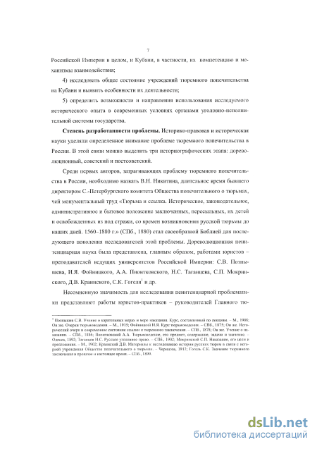 Среди первых авторов, затрагивающих проблему тюремного попечительства в России, необходимо назвать В.Н. Никитина, длительное время бывшего директором С.-Петербургского комитета Общества попечительного о тюрьмах, чей монументальный труд «Тюрьма и ссылка. Историческое, законодательное, административное и бытовое положение заключенных, пересыльных, их детей и освобожденных из под стражи, со времен возникновения русской тюрьмы до наших дней. 1560-1880 г.» (СПб., 1880) стал своеобразной Библией для последующего поколения исследователей этой проблемы. Дореволюционная пенитенциарная наука была представлена, главным образом, работами юристов -преподавателей ведущих университетов Российской Империи: СВ. Позны-шева, И.Я. Фойницкого, А.А. Пионтковского, Н.С. Таганцева, СП. Мокрин-ского, Д.В. Краинского, СК. Гогеля1 и др.