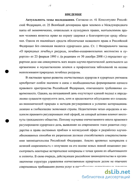 Актуальность темы исследования. Согласно ст. 41 Конституции Российской Федерации, ст. 25 Всеобщей декларации прав человека и Международного пакта об экономических, социальных и культурных правах, неотъемлемым правом человека является право на охрану здоровья и благоприятную среду обитания. Одним из важнейших средств обеспечения названного права в Российской Федерации без сомнения является курортного дело. Ст. 1 Федерального закона «О природных лечебных ресурсах, лечебно-оздоровительных местностях и курортах» от 23 февраля 1995 г. (в редакции от 30 декабря 2008 г.) определяет курортное дело как совокупность всех видов научно-практической деятельности по организации и осуществлению лечения и профилактики заболеваний на основе использования природных лечебных ресурсов.