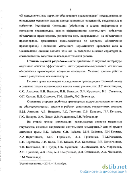 В опросе приняли участие 2007 россиян. См.: Самые острые проблемы // 2 В опросе приняли участие 1611 россиян в возрасте 18 лет и старше в 133 населенных пунктах 45 регионов страны. См.: Кого защищает закон? // 2011012000.html 3 Вступительное слово Президента РФ Д.А. Медведева на совещании о дополнительных мерах по обеспечению правопорядка// «О дополнительных мерах по обеспечению правопорядка»4 последовательно определены основные задачи координационных совещаний, создаваемых в субъектах Российской Федерации (обобщение и анализ информации о состоянии правопорядка, анализ эффективности деятельности субъектов обеспечения правопорядка, разработка мер, направленных на обеспечение правопорядка, организация взаимодействия по вопросам обеспечения правопорядка). Положения указанного нормативного правового акта в значительной степени оказали влияние на авторское видение структуры и, соответственно, содержание исследовательской работы.