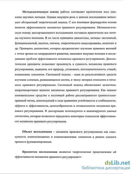 Методологическую основу работы составляет практически весь комплекс научных методов. Однако ведущую роль в данном исследовании выполняет абстрактный теоретический подход. С его помощью формируется основа понятия эффективности механизма правового регулирования. Методологическую основу диссертационного исследования составили практически все методы научного познания. В их числе принципы диалектики, методы: системный, функциональный, анализа, синтеза, теоретического моделирования, аналогии и др. Принципы диалектики, которые предполагают изучение правовых явлений с точки зрения их непрерывного развития, занимают ведущие позиции в исследовании проблем эффективности механизма правового регулирования. Диалектические принципы позволяют проникнуть в сущность механизма правового регулирования, выяснить его природу, установить последовательность стадий, взаимосвязь элементов. Системный подход - один из результативных средств изучения сложных, развивающихся систем, к числу которых относится и механизм правового регулирования. Системный подход обеспечивает целостное, непротиворечивое видение механизма правового регулирования. Как важное познавательное средство в настоящей работе рассматривается сравнительно-правовой метод, используемый в ходе сравнения устойчивости и стабильности, эффекта и эффективности, целесообразности и оптимальности механизма правового регулирования. В диссертации используются и анализируются данные статистики, которые позволили определить некоторые показатели эффективности механизма правового регулирования.