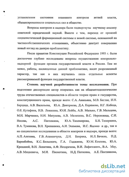Степень научной разработанности темы исследования. При подготовке диссертации автор опиралась как на общеметодологические труды отечественных специалистов в области теории права и государства, конституционного права, прежде всего: С.А. Авакьяна, М.В. Баглая, И.Н. Барцица, А.В. Васильева, Ю.А. Дмитриева, Д.А. Керимова, Н.Г. Кобеца, О.Е. Кутафина, И.В. Левакина, Ю.И. Лейбо, А.В. Малько, Г.В. Мальцева, М.Н. Марченко, Н.И. Матузова, А.В. Мелехина, B.C. Нерсесянца, СИ. Носова, А.С. Пиголкина, Ю.А. Тихомирова, Б.Н. Топорнина, В.А. Туманова, В.Н. Хропанюка, А.И. Экимова, И.С. Яценко и др., так и на специальные исследования в области контроля и надзора, прежде всего: А.П. Алехина, Г.В. Атаманчука, Д.Н. Бахраха, И.Л. Бачило, П.Д. Баренбойма, К.С. Вельского, Г.А. Гаджиева, Ю.М. Козлова, Ю.А. Крохиной, В.Н. Лопатина, А.Ф. Ноздрачева, В.И. Лафитского., В.А. May, А.В. Мицкевича, М.И. Пискотина, Н.Д. Погосяна, А.Е. Постникова,