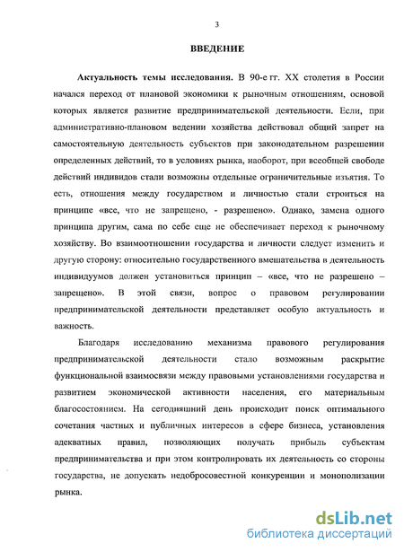 Актуальность темы исследования. В 90-е гг. XX столетия в России начался переход от плановой экономики к рыночным отношениям, основой которых явилось развитие предпринимательской деятельности. Если при административно-плановом ведении хозяйства действовал общий запрет на самостоятельную деятельность субъектов при законодательном разрешении определенных действий, то в условиях рынка, наоборот, при всеобщей свободе действий субъектов стали возможны отдельные ограничительные изъятия. То есть отношения между государством и личностью стали строиться на принципе «все, что не запрещено, — разрешено». Однако замена одного принципа другим сама по себе еще не обеспечивает переход к рыночному хозяйству. Во взаимоотношении государства и личности следует изменить и другую сторону: относительно государственного вмешательства в деятельность индивидов должен установиться принцип «все, что не разрешено, — запрещено». В этой связи вопрос о правовом регулировании предпринимательской деятельности представляет особую актуальность и важность.