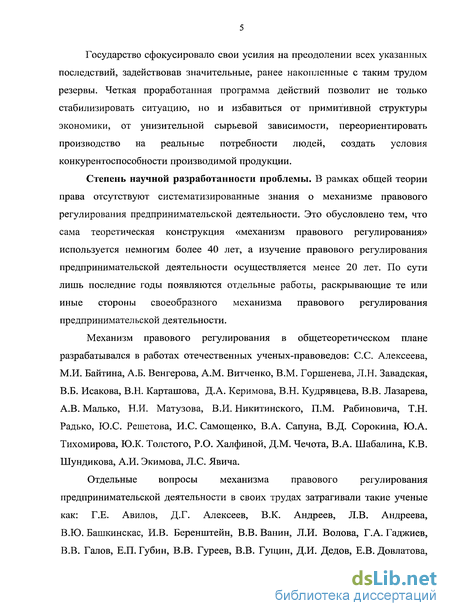 Степень научной разработанности проблемы. В рамках общей теории права отсутствуют систематизированные знания о механизме правового регулирования предпринимательской деятельности. Это обусловлено тем, что сама теоретическая конструкция «механизм правового регулирования» используется немногим более 40 лет, а изучение правового регулирования предпринимательской деятельности осуществляется менее 20 лет. По сути лишь в последние годы появились отдельные работы, раскрывающие те или иные стороны своеобразного механизма правового регулирования данной сферы.