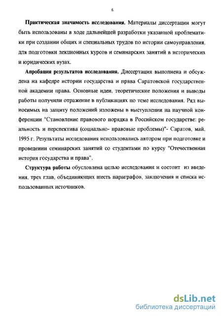 Апробация результатов исследования. Диссертация выполнена и обсуждена на кафедре истории государства и права Саратовской государственной академии права. Основные идеи, теоретические положения и выводы работы получили отражение в публикациях по теме исследования. Ряд выносимых на защиту положений изложены в выступлении на научной конференции "Становление правового порядка в Российском государстве: реальность и перспектива (социально- правовые проблемы)"- Саратов, май, 1995 г. Результаты исследования использовались автором при подготовке и проведении семинарских занятий со студентами по курсу "Отечественная история государства и права".