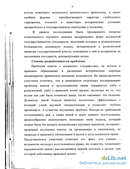 Проблема власти в исламских государствах, ее истоки и правовое образование в различные исторические периоды неоднократно привлекало внимание исламистов. Но представляется уместным отметить, что в имеющихся отдельных исследованиях проблема власти в мусульманском праве отражается либо с религиозной, либо с правовой точки зрения, несмотря на то, что ислам как уже было отмечено выше, тесно связывает эти понятия. Думается, такой подход является достаточно эффективным с позиций узкой научной специализации и позволяет глубоко проникнуть в существо изучаемых проблем. Исходя из требований сегодняшнего дня, а также целей и задач данного исследования, целесообразнее использовать несколько иной подход, который можно было бы назвать комплексным научным анализом, историко-правовым изучением власти, ее организации и механизмов, ее природы и правового обоснования в целом в мусульманском праве. Представляется уместным отметить тот факт, что ученые -исламисты исследуя мусульманское право, по существу, подменяют юридический анализ рассмотрением данной системы в целом, при которой собственно правовой аспект проблемы отступает на второй план и поэтому практически не затрагивается. В основе такого рассмотрения, как уже отличалось, лежит понимание мусульманского права прежде всего как элемента религиозной системы или как универсального социального регулятора. Наблюдается и обратная связь: мусульманское право часто называется религиозным и рассматривается в качестве всеобъемлющего комплекса самых разнообразных по характеру норм именно потому, что оно отождествляется с исламской системой государственно-правового регулирования в целом.