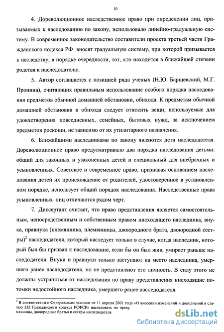 Диссертант считает, что право представления является самостоятельным, непосредственным и собственным правом нисходящего наследника, внука, правнука (племянника, племянницы, двоюродного брата, двоюродной сеет-ры) наследодателя, который наследует только в случае, когда наследник, который был бы призван к наследованию, если бы он был жив, умирает раньше наследодателя. Внуки и правнуки только заступают на место наследника, умершего ранее наследодателя, но не представляют его личность. В силу этого не должны устраняться от наследования по праву представления нисходящие потомки недостойного наследника, умершего ранее наследодателя.
