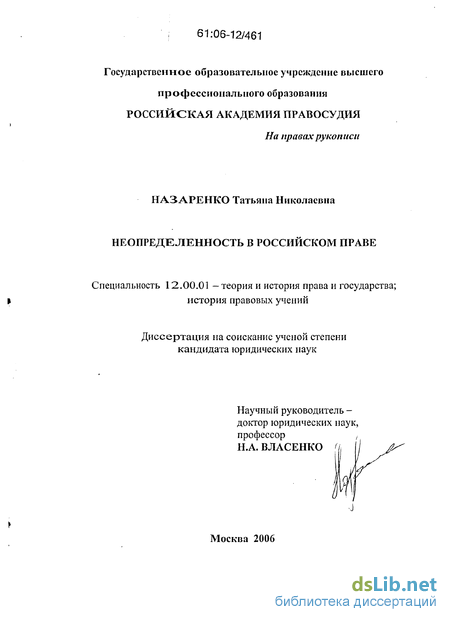 В отечественном правоведении отсутствует устоявшееся понятие «неопределенность в праве»; нет и общетеоретических монографических I работ, специально посвященных исследованию этой проблематики. Между