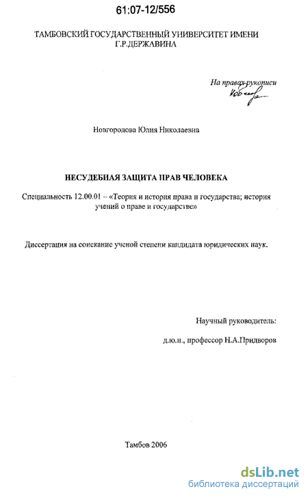 Степень разработанности темы. Избранная для диссертационного исследования тема не получила широкой разработки в юридической литературе и рассматривалась, как правило, в рамках общей проблемы защиты прав и свобод личности, а так же при исследовании вопроса о формах защиты субъективного права. При рассмотрении существующей по данной проблематике литературы обращает на себя внимание тот факт, что практически отсутствуют крупные монографические работы, посвященные несудебной форме защите прав граждан.