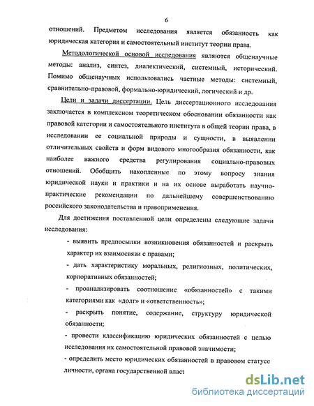 Цели и задачи диссертации. Цель диссертационного исследования заключается в комплексном теоретическом обосновании обязанности как правовой категории и самостоятельного института в общей теории права, в исследовании ее социальной природы и сущности, в выявлении отличительных свойств и форм видового многообразия обязанности, как наиболее важного средства регулирования социально-правовых отношений. Обобщить накопленные по этому вопросу знания юридической науки и практики и на их основе выработать научно-практические рекомендации по дальнейшему совершенствованию российского законодательства и правоприменения.