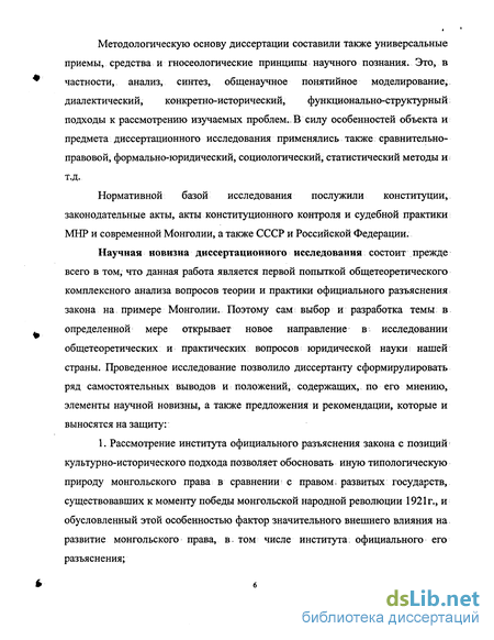 Научная новизна диссертационного исследования состоит прежде всего в том, что данная работа является первой попыткой общетеоретического комплексного анализа вопросов теории и практики официального разъяснения закона на примере Монголии. Поэтому сам выбор и разработка темы в определенной мере открывает новое направление в исследовании общетеоретических и практических вопросов юридической науки нашей страны. Проведенное исследование позволило диссертанту сформирулировать ряд самостоятельных выводов и положений, содержащих, по его мнению, элементы научной новизны, а также предложения и рекомендации, которые и выносятся на защиту: