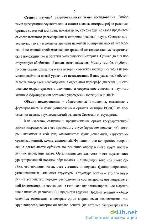 Степень научной разработанности темы исследования. Выбор темы диссертации осуществлен на основе анализа историографии развития органов советской юстиции, показавшего, что она еще не стала предметом самостоятельного рассмотрения в историко-правовой науке. Следует подчеркнуть, что к настоящему времени накоплен обширный массив исследований по данной проблематике, содержащий не только важные теоретические положения, но и богатый эмпирический материал. Однако до сих пор отсутствует обобщающий анализ этого наследия. Между тем, без глубокого осмысления опыта изучения истории советской юстиции сегодня невозможно выйти на новый уровень ее исследования. Ввиду указанных обстоятельств автор счел необходимым в отдельном параграфе диссертации специально охарактеризовать эволюцию и современное состояние научного знания о формировании органов и учреждений юстиции в РСФСР. Объект исследования - общественные отношения, связанные с формированием и функционированием органов юстиции РСФСР на протяжении первых двух десятилетий развития Советского государства.
