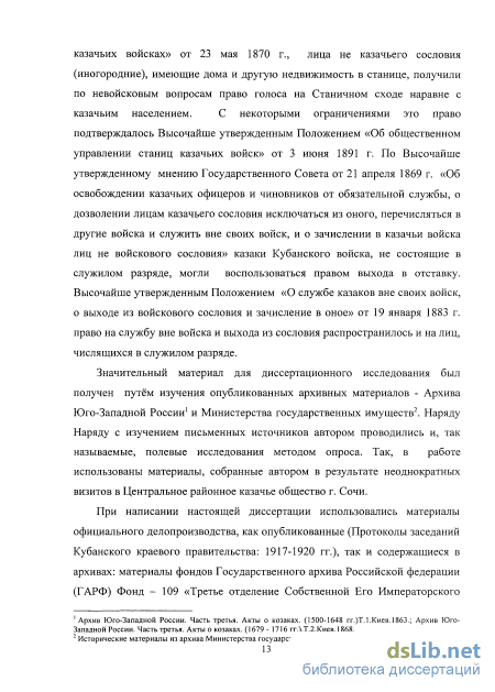 Значительный материал для диссертационного исследования был получен путём изучения опубликованных архивных материалов - Архива Юго-Западной России1 и Министерства государственных имуществ2. Наряду Наряду с изучением письменных источников автором проводились и, так называемые, полевые исследования методом опроса. Так, в работе использованы материалы, собранные автором в результате неоднократных визитов в Центральное районное казачье общество г. Сочи.