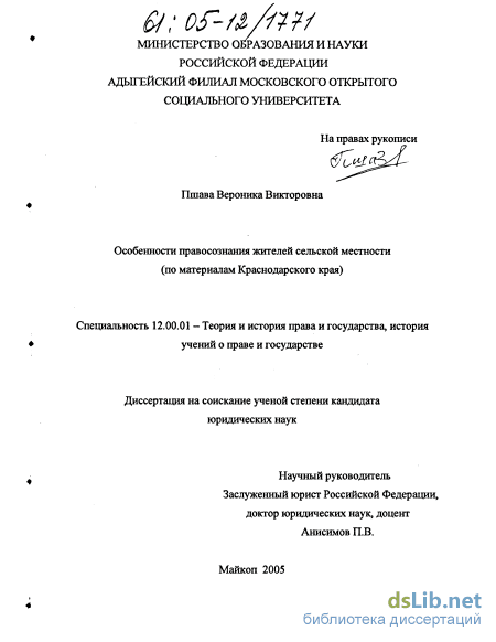 Предмет исследования - правосознание жителей сельской местности (на материалах Краснодарского края), его взаимосвязи с правовым регулированием основных аспектов их жизнедеятельности.