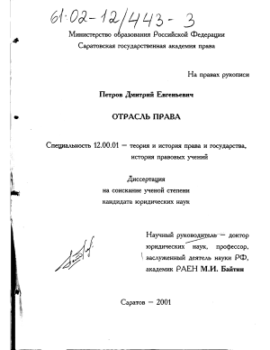 Непросто объяснить и тот факт, что, несмотря на понятный интерес юриспруденции к вопросам системы права как одной из основополагающих проблем теории права, ни в советской, ни в современной российской юридической науке вплоть до последнего времени не проводилось на монографическом, в том числе диссертационном, уровне общетеоретического исследования отрасли права и соответствующей категории, относящейся, можно сказать, к самой сердцевине данной проблемы.