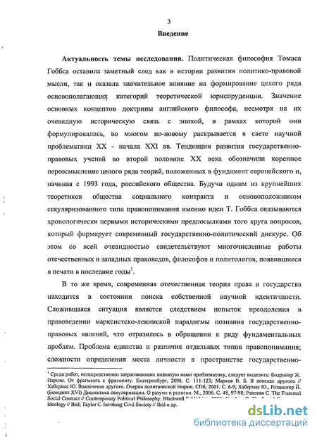 Актуальность темы исследования. Политическая философия Томаса Гоббса оставила заметный след как в истории развития политико-правовой мысли, так и оказала значительное влияние на формирование целого ряда основополагающих категорий теоретической юриспруденции. Значение основных концептов доктрины английского философа, несмотря на их очевидную историческую связь с эпохой, в рамках которой они формулировались, во многом по-новому раскрывается в свете научной проблематики XX - начала XXI вв. Тенденции развития государственно-правовых учений во второй половине XX века обозначили коренное переосмысление целого ряда теорий, положенных в фундамент европейского и, начиная с 1993 года, российского общества. Будучи одним из крупнейших теоретиков общества социального контракта и основоположником секуляризованного типа правопонимания именно идеи Т. Гоббса оказываются хронологически первыми историческими предпосылками того круга вопросов, который формирует современный государственно-политический дискурс. Об этом со всей очевидностью свидетельствуют многочисленные работы отечественных и западных правоведов, философов и политологов, появившиеся в печати в последние годы1.