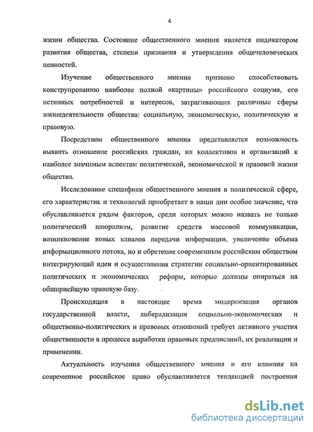 Исследование специфики общественного мнения в политической сфере, его характеристик и технологий приобретает в наши дни особое значение, что обуславливается рядом факторов, среди которых можно назвать не только политический плюрализм, развитие средств массовой коммуникации, возникновение новых каналов передачи информации, увеличение объема информационного потока, но и обретение современным российским обществом интегрирующий идеи и осуществления стратегии социально-ориентированных политических и экономических реформ, которые должны опираться на обширнейшую правовую базу.
