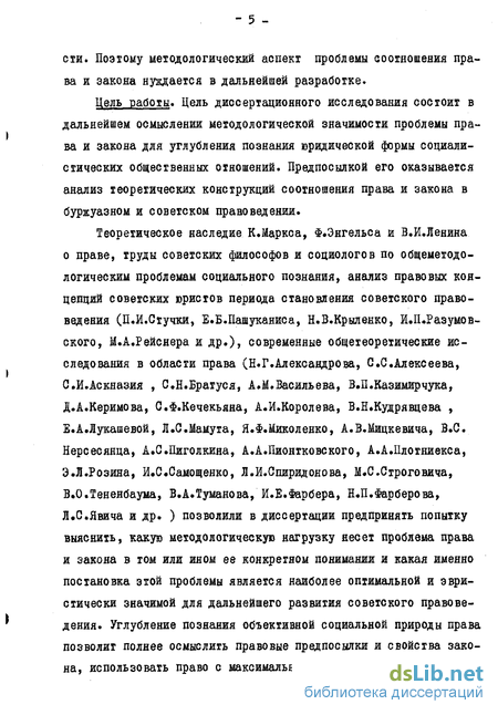 Теоретическое наследие К.Маркса, Ф.Энгельса и В.И.Яенина о праве, труды советских философов и социологов по общеметодологическим проблемам социального познания» анализ правовых концепций советских юристов периода становления советского правоведения (П.И.Стучки, Е.Б.Пашуканиса, Н.В.Крыленко, И.П.Разумовского, М.А.Рейснера и др.), современные общетеоретические исследования в области права (Н.Г.Александрова, С.С.Алексеева, С.И.Аскназия , С.Н.Братуся, A.M.Васильева, В.ЇЇЛСазимирчука, Д.А.Керимова, С.Ф.Кечекьяна, А.И.Королева, В.Н»Кудрявцева , Е.А.Лукашевой, Л.С.Мамута, Я.Ф.Миколенко, А.З.Мицкевича, B.C. Нерсесянца, А.С.Пиголкина, А.А.Пионтковского, А.А.Плотниекса, Э.Л.Розина, И.С.Самощенко, Л.И.Спирддонова, М*С.Строгошча, В.О.Тененбаума, В.А.Туманова, И.Е.Фарбера, НЛ.Фарберова, Л.С.Явича и др. ) позволили в диссертации предпринять попытку выяснить, какую методологическую нагрузку несет проблема права и закона в том или ином ее конкретном понимании и какая именно постановка этой проблемы является наиболее оптимальной и эвристически значимой для дальнейшего развития советского правоведения. Углубление познания объективной социальной природы права позволит полнее осмыслить правовые предпосылки и свойства закона, использовать право с максимальной эффективностью в процессе