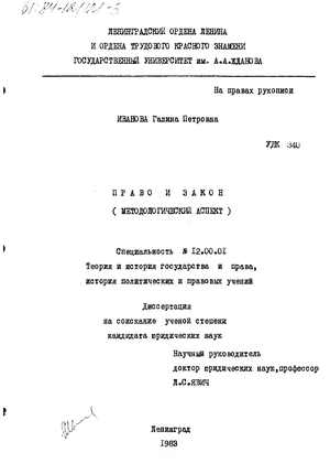 Цель работы* Цель диссертационного исследования состоит в дальнейшем осмыслении методологической значимости проблемы права и закона для углубления познания юридической формы социалистических общественных отношений. Предпосылкой его оказывается анализ теоретических конструкций соотношения права и закона в буржуазном и советском правоведении.