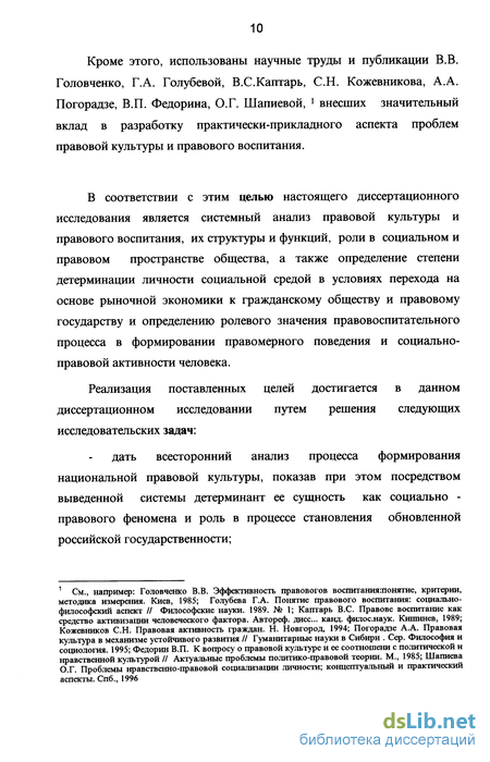 В соответствии с этим целью настоящего диссертационного исследования является системный анализ правовой культуры и правового воспитания, их структуры и функций, роли в социальном и правовом пространстве общества, а также определение степени детерминации личности социальной средой в условиях перехода на основе рыночной экономики к гражданскому обществу и правовому государству и определению ролевого значения правовоспитательного процесса в формировании правомерного поведения и социально-правовой активности человека.