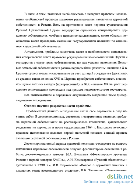 Степень научной разработанности проблемы. Проблематика данного исследования нашла свое отражение в ряде научных работ. В дореволюционных, советских и современных изданиях проблема церковной собственности не рассматривалась комплексно, существовало разделение на период до и после секуляризации 1764 г. Настоящее историко-правовое исследование является первой попыткой показать единый процесс эволюции церковной собственности в России.