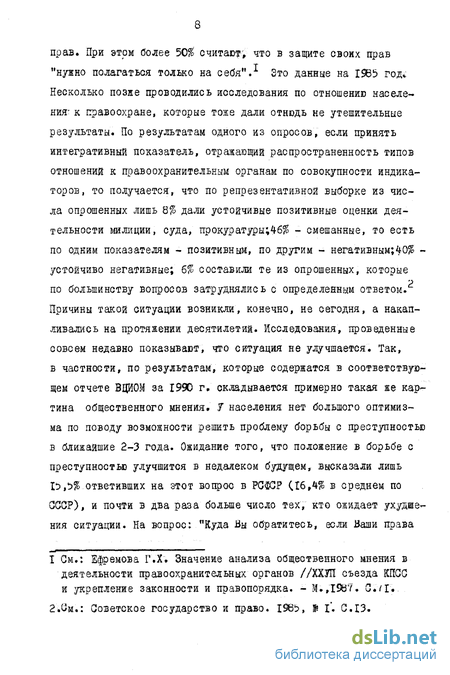 Гласность позволила обнаружить недостатки в правоохранительной системе, слабое реагирование юридических учреждений на факты противоправного поведения, отягощенность стереотипами прошлого. Оказалось, что в ряде случаев правоохранительная система, призванная защищать человека, по существу, оборачивается против него. Косвенно об этом свидетельствуют данные социологических исследовании, которые проводились в разное время. По данным НИИКСИ ЛГУ, только 17,6% опрошенных склонны прибегнуть к защите вридвческиии средствами при угрозе нарушения их прав. Ори этом более 50$ считают; что в защите СВОИХ прав "нужно полагаться только на себя". Это данные на 1835 год Несколько позже проводились исследования по отношению населе-ншг к правоохране, которые тоже дали отнюдь не утешительные результаты. По результатам одного из опросов, если принять ннтегративный показатель, отражающий распространенность типов отношений к правоохранительным органам по совокупности индикаторов, то получается, что по репрезентативной выборке из числа опрошенных лишь Б% дали устойчивые позитивные оценки деятельности милиции, суда, прокуратуры;46$ - смешанные, то есть по одним показателям - позитивным, по другим - негативным;kO% -устойчиво негативные; 6% составили те из опрошенных, которые по большинству вопросов затруднялись с определенным ответом.2 Причины такой ситуации возникли, конечно, не сегодня, а накапливались на протяжении десятилетий. Исследования, проведенные совсем недавно показывают, что ситуация не улучшается. Так, в частности, по результатам, которые содержатся в соответствующем отчете ВЦИОМ за 1990 г. складывается примерно такая же картина общественного мнения. 7 населения нет большого оптимизма по поводу возможности решить проблему борьбы с преступностью в ближайшие 2-3 года. Ожидание того, что положение в борьбе с преступностью улучшится в недалеком будущем, высказали лишь It?,t)% ответивших на этот вопрос в PGfCP С16 »4% в среднем по СССР), и почти в два раза больше число тех, кто ожидает ухудшения ситуации. На вопрос; "Куда Вы обратитесь, если Ваши права нарушены должностным лицом?", 41,2% опрошенных ответили, что обращаться бесполезно, 22,9$ считают, что обращаться нужно в газету, 18,2% - в суд, 14,5$ - к адвокату, 13,1 - к прокурору, Ц,! % - в милицию, 4,t % - в другое место. Затруднились ответить V5tb% опрошенных Эти же исследования выявили низкий уровень доверия к правоохранительным органам. Только 20,9% опрошенных считают,что милиция вполне заслуживает доверия,а 24,8% считает, что доверия она совсем не заслуживает По мнению 19,6% суд и прокуратура вполне заслуживают доверия. Вместе с тем 18,9% высказались за то, что суд и прокуратура доверия не заслуживают. Самый большой процент лиц, которые считают, что милиция, суд и прокуратура не вполне заслуживают доверия МИЛИЦИЯ соответственно - 40,8%, а прокуратура и суд - 41,0%,
