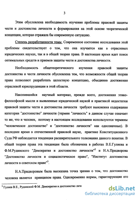Проблема правовой защиты чести и достоинства личности не может быть разрешена без анализа новейших тенденций в решении проблемы защиты права как в общетеоретическом правоведении , так и отраслевых науках. Вопросы защиты личных неимущественных прав, в том числе чести и достоинства человека, были предметом исследования в работах М.М.Агаркова, А.Л.Анисимова, А.В.Белявского, С.Н.Братуся, О.С.Иоффе, Л.О. Красавчиковой, Н.С.Малеина, М.Н.Малеиной, НАПридворова, Л.К. Рафиевой, ВАТархова, ЕАФлейшиц, А.М.Эрделевского, К.Б. Ярошенко и других.