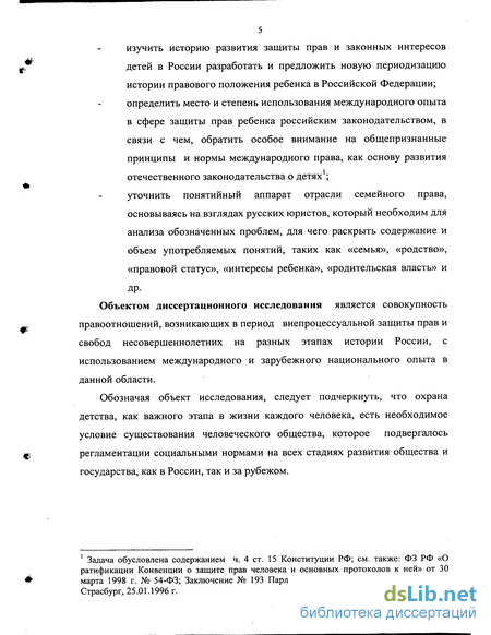 истории правового положения ребенка в Российской Федерации; определить место и степень использования международного опыта в сфере защиты прав ребенка российским законодательством, в связи с чем, обратить особое внимание на общепризнанные принципы и нормы международного права, как основу развития отечественного законодательства о детях1;