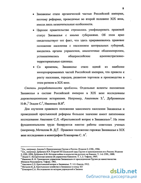 Степень разработанности проблемы. Отдельные аспекты положения Закавказья в составе Российской империи в XIX веке исследованы дореволюционными историками. Например, Аваловым З.1, Дубровиным Н.Ф.,2 Эсадзе С.3, Иваненко В.И4.