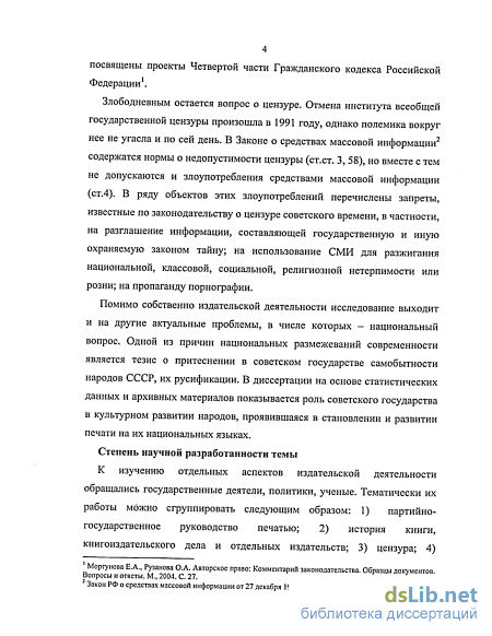 В основу конструкции работы заложен проблемный принцип. Диссертация состоит из введения, четырех глав, заключения, библиографии. Первые две главы посвящены отраслям права -административному и гражданскому - и отражают позитивное регулирование. Третья глава посвящена ответственности за правонарушения в сфере издательской деятельности. Освещение собственно правовых вопросов советской издательской системы было бы не полным без раскрытия роли партийного руководства в ее формировании и функционировании. Это регулирование не укладывается в собственно воздействие норм и институтов права. Отсюда вполне оправданно обращение к проблемам влияния советской идеологии на формирование