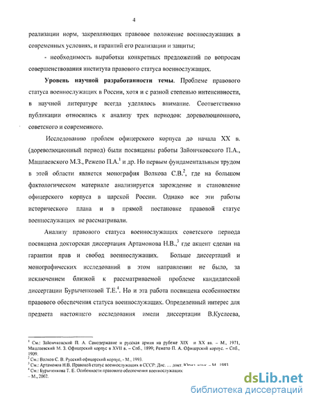 Анализу правового статуса военнослужащих советского периода посвящена докторская диссертация Артамонова Н.В., где акцент сделан на гарантии прав и свобод военнослужащих. Больше диссертаций и монографических исследований в этом направлении не было, за исключением близкой к рассматриваемой проблеме кандидатской диссертации Бурыченковой Т.Е.4. Но и эта работа посвящена особенностям правового обеспечения статуса военнослужащих. Определенный интерес для предмета настоящего исследования имели диссертации В.Куслеева,