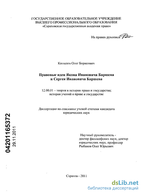 Актуальность темы исследования. Значение исследования правовых взглядов Якова Ивановича и Сергея Ивановича Баршевых обусловливается необходимостью представить полную картину состояния российской юридической науки в период их жизни и деятельности (30-80-е годы XIX в.). На протяжении XX в. в России не проводилось комплексных исследований правовых идей вышеуказанных ученых, что существенно обедняет представления не только о содержании их взглядов, но и показывает неоправданную невостребованность идей выдающихся представителей юридической науки.
