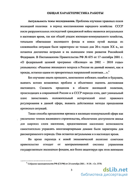 Актуальность темы исследования. Проблемы изучения правовых основ жилищной политики в период восстановления народного хозяйства СССР после разрушительных последствий гражданской войны являются актуальными в настоящее время, так как общий упадок жилищно-коммунального хозяйства, тотальное обветшание жилищного фонда и поиск путей выхода из сложившейся ситуации были характерны не только для 20-х гг XX в, но остаются достаточно острыми и на нынешнем этапе развития Российской Федерации В постановлении Правительства РФ от 17 09 2001 № 675 «О федеральной целевой программе "Жилище" на 2002—2010 годы» указывалось, что «решение жилищного вопроса в России на данный момент, как и прежде, остается одним из приоритетных направлений политики»