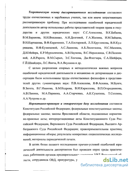 С целью разрешения спорных и методологически важных вопросов ошибочной юридической деятельности и механизма ее детерминации в диссертации были использованы труды отечественных философов и представителей других гуманитарных наук: П.В.Алексеева, Я.Ф.Аскина, М.Бунге, В.Зегета, В.Г.Иванова, Б.М.Кедрова, В.И.Кириллова, В.П.Огородникова, А.В.Панина, М.А.Парнюка, А.А.Старченко, А.К.Сухотина, Т.Селлина, А.А.Чупрова и др.