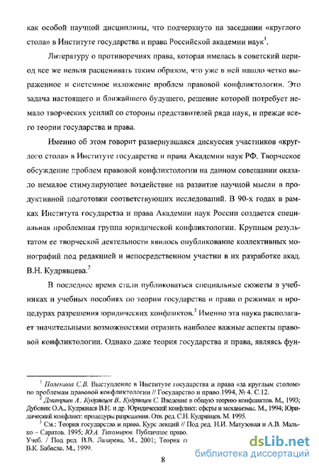 Именно об этом говорит развернувшаяся дискуссия участников «круглого стола» в Институте государства и права Академии наук РФ. Творческое обсуждение проблем правовой конфликтологии на данном совещании оказало немалое стимулирующее воздействие на развитие научной мысли в продуктивной подготовки соответствующих исследований. В 90-х годах в рамках Института государства и права Академии наук России создается специальная проблемная группа юридической конфликтологии. Крупным результатом ее творческой деятельности явилось опубликование коллективных монографий под редакцией и непосредственном участии в их разработке акад. В.Н. Кудрявцева.2