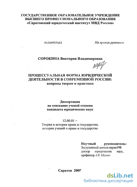 Таким образом, настоящее диссертационное исследование посвящено формированию в отечественном правоведении новых знаний о процессуальной форме юридической деятельности, выявлению проблем и перспектив ее развития. Отсюда и название работы - «Процессуальная форма юридической деятельности в современной России: вопросы теории и практики».