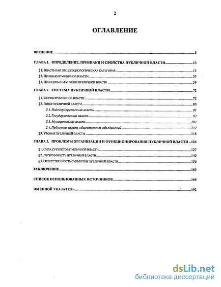 Структура диссертации отвечает поставленным целям и задачам и обусловлена характером используемых источников. Диссертация состоит из введения, трех глав, подразделенных на девять параграфов, списка использованной литературы и именного указателя. В первой главе проводится анализ власти как общесоциологического понятия, выделяются признаки, принципы и функции публичной власти. Во второй главе рассматривается система публичной власти, в том числе формы, виды, уровни публичной власти. Третья глава носит прикладной характер и посвящена анализу практических проблем, возникающих при организации и функционировании публичной власти в современных условиях.