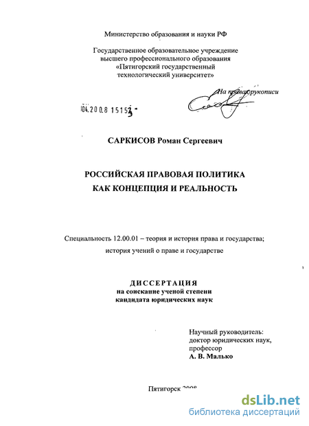 Актуальность темы исследования. В настоящее время российская правовая политика как необходимая феноменологическая структура правовой жизни переживает важный этап своего развития - институциализацию в сфере принятия политических решений, научном сообществе, социальной практике и правовой реальности. Определяемый относительной стабилизацией существующей политической ситуации в стране курс социального развития влияет на планомерное совершенствование механизмов повышения качества жизни российских граждан и требует адекватного правового обеспечения. Выстраивание и реализация эффективной правовой политики в данной связи чрезвычайно актуальны, поскольку сбалансированное социальное правовое государство немыслимо без соответствующей стабильной правовой системы и социального законодательства. В этих условиях правовая политика - конструктивное и эффективное средство преодоления негативных моментов в развитии Российского государства: она организует правовую жизнь и активизирует принципы взаимодействия гражданского общества и правового государства. Кроме того, правовая политика как сфера целеполагаемой социальной и политической практики, мощный социально-организующий фактор направлена на планомерное позитивное преобразование общественных отношений и их форм. Таким образом, благодаря правовой политике осуществляется системное выстраивание стратегии правового развития общества.